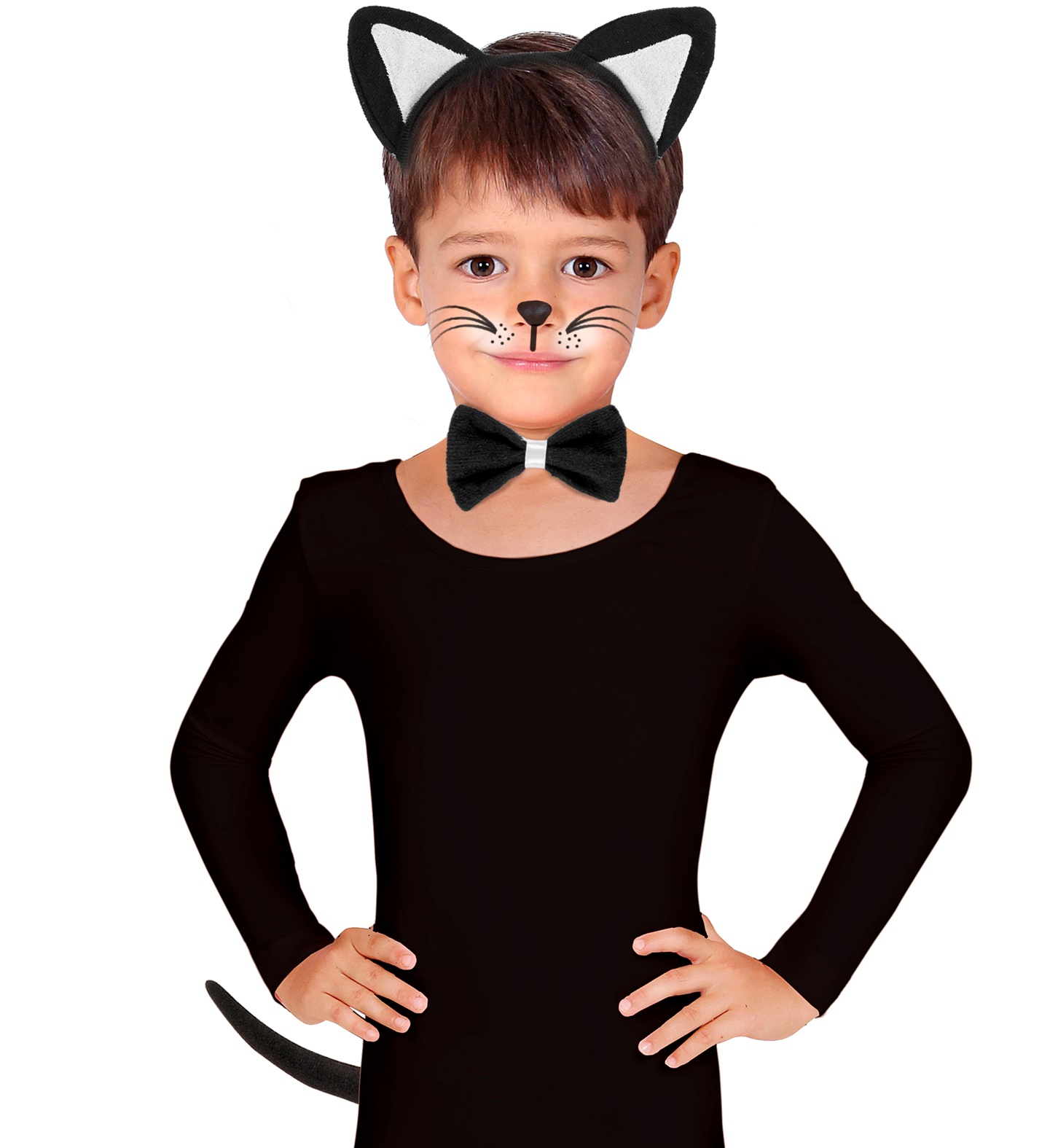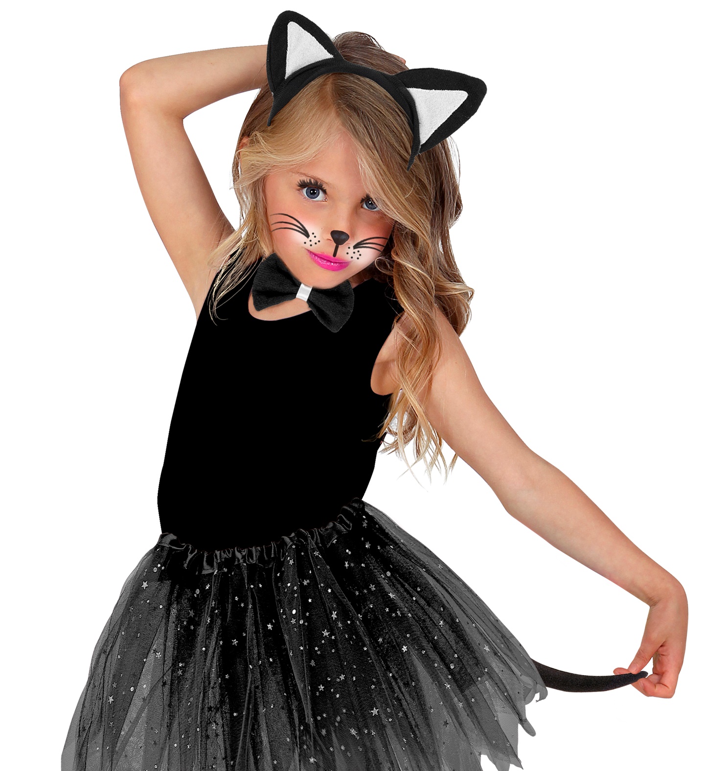 Komplektā ietilpst: galvas saite ar kaķa ausīm, gara melna aste un tauriņš.