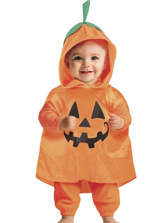 Bērnu apmetnis Ķirbis, oranžā krāsā, ar ķirbja seju un zaļu ķirbja kātu uz kapuces.