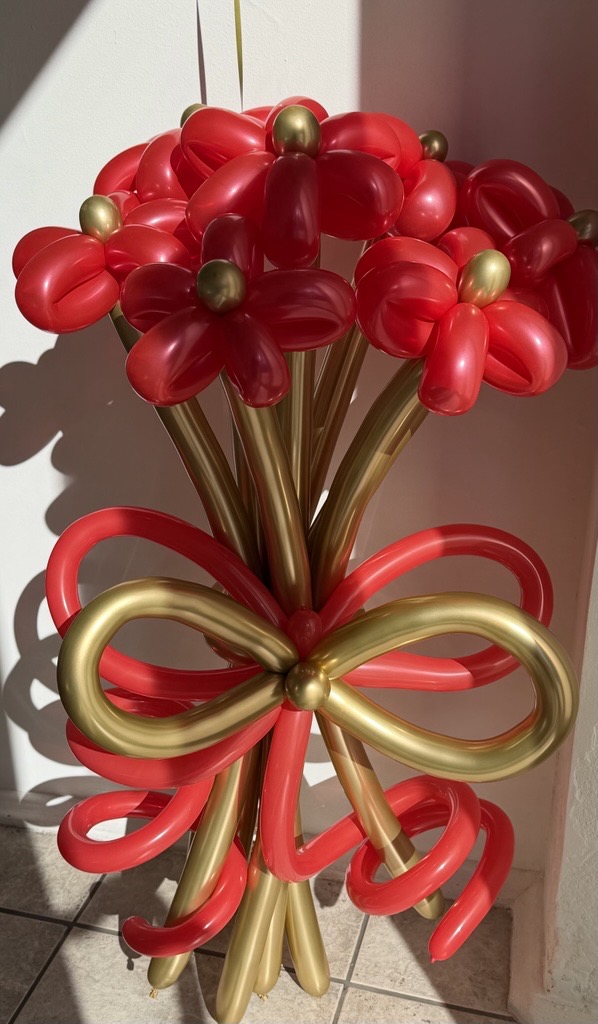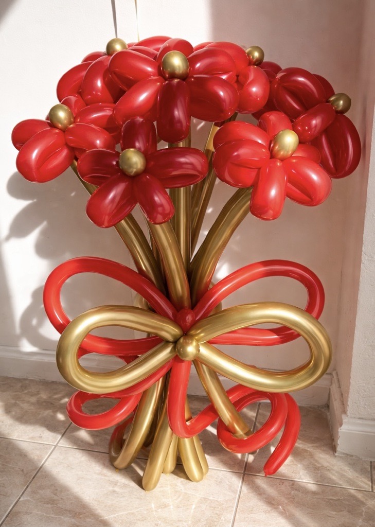 Balonu ziedu pušķis, kas sastāv no 7 balonu ziediem un dekoratīvas balonu bantes. Oriģināla un pamanāma dāvana dažādiem svētkiem, kas piešķir priecīgu un svinīgu noskaņu.