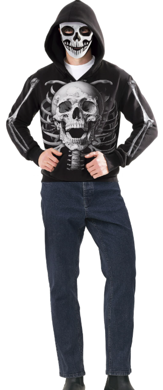 Galvaskausa kapučjaka (kopā ar masku) - melna kapučjakas jaka, kas dekorēta ar reālistisku galvaskausa un skeleta kaula apdruku priekšpusē, aizmugurē un piedurknēs.