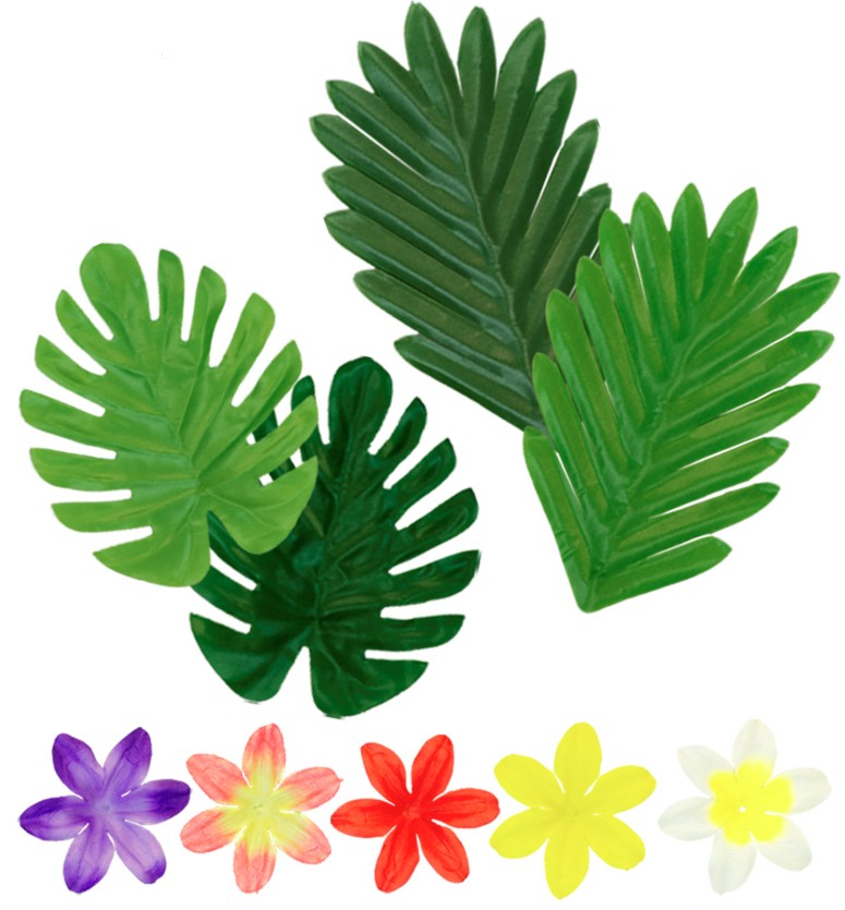 Komplektā ietilpst dažādu formu un krāsu dekoratīvas tropiskas lapas un ziedi, kurus var izkaisīt uz svētku galda, izmantot foto sienas vai citu svinību vietu dekorēšanai. Spilgtas krāsas un tropiskie motīvi piešķirs dekoram eksotisku šarmu.