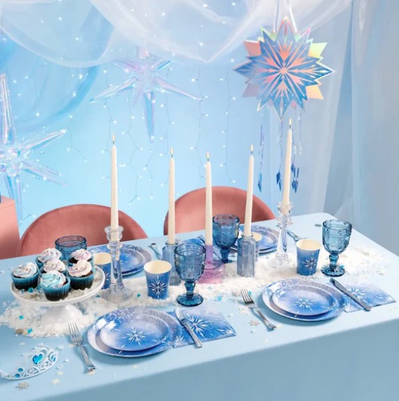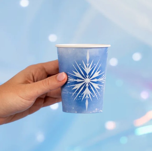 Zilas papīra glāzītes, kas dekorētas ar sniegpārsliņu rakstu.