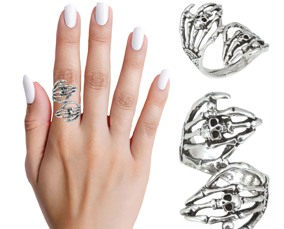 Metāla gredzens ar skeleta rokām, kas dekorētas ar galvaskausiem.