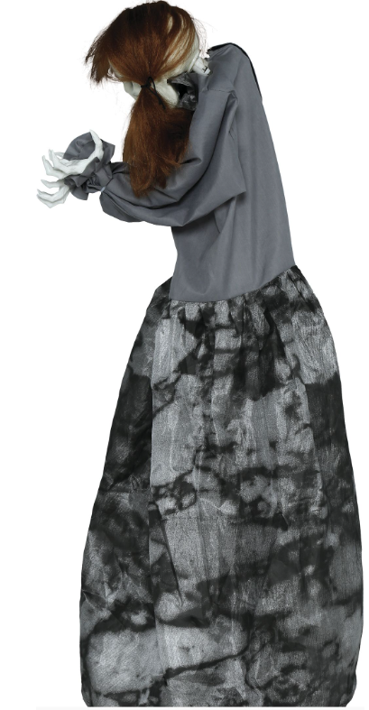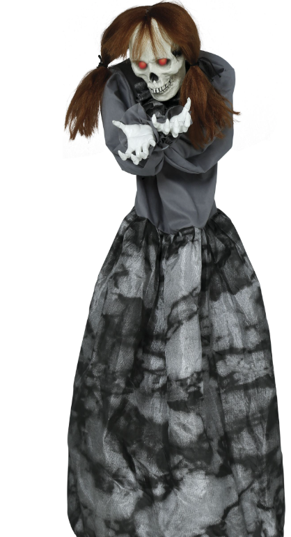 Interaktīvā dekorācija "Ubags" ir skeleta lelle garā, tumšā apmetnī. Viņas tievās, kaulainās rokas ir izstieptas uz priekšu, it kā lūdzot palīdzību vai cenšoties jūs sasniegt. Balts galvaskauss ar smailiem zobiem, un acis mirdz spilgti sarkanā gaismā, pastiprinot atmosfēru.
