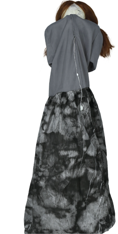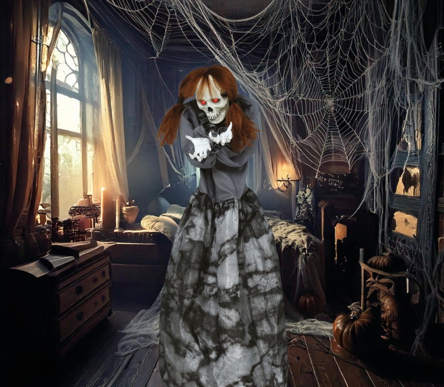 Интерактивная декорация «Нищий» — это жуткая кукла-скелет в длинном тёмном плаще. Её тонкие, костлявые руки вытянуты вперёд, словно она молит о помощи или пытается дотянуться до вас. На её лице — белый череп с острыми зубами, а глаза светятся ярко-красным светом, усиливая жуткую атмосферу.