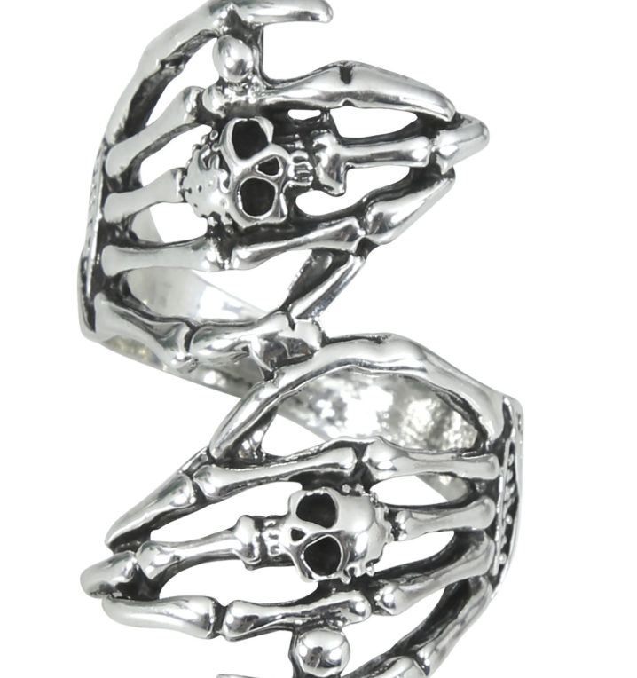 Металлическое кольцо с руками-скелетами, украшенное черепами.