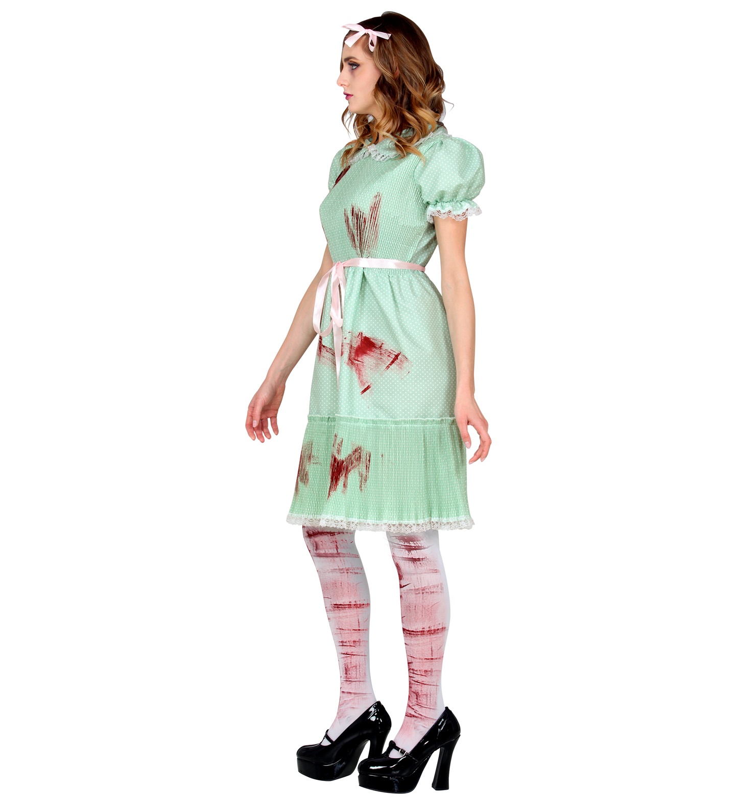 Kostīms slepkavas lelle - kostīms sastāv no zaļas kleitas ar smalkām mežģīņu detaļām. Kleita ir dekorēta ar "asiņainām" sarkanām svītrām, kas rada šausmīgi biedējošu noskaņu. Rozā josta jostasvietā izceļ figūru un rada kontrastu ar baiso stilu. Komplektu papildina baltas zeķes ar sarkanām "asiņu" svītrām, kas atbilst lelles tēlam.