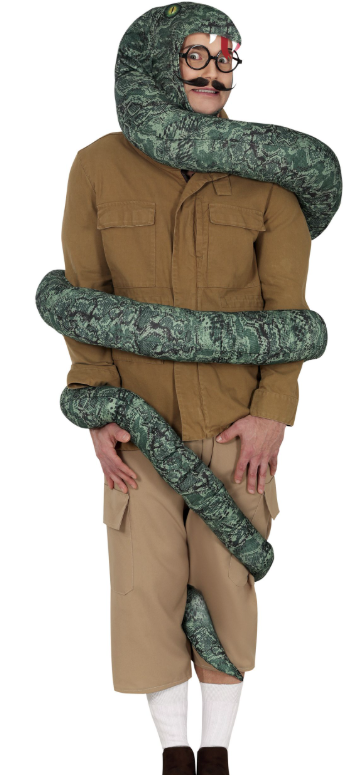Костюм «Атака змеи» — огромная зелёная змея обвивает ваше тело с головы до ног, создавая очень убедительный эффект. Змея крепится к телу четырьмя белыми резинками. Голова змеи завязывается как шляпа. Этот костюм подойдёт тем, кто хочет выделиться из толпы и выбрать что-то оригинальное, а не просто пугающее.