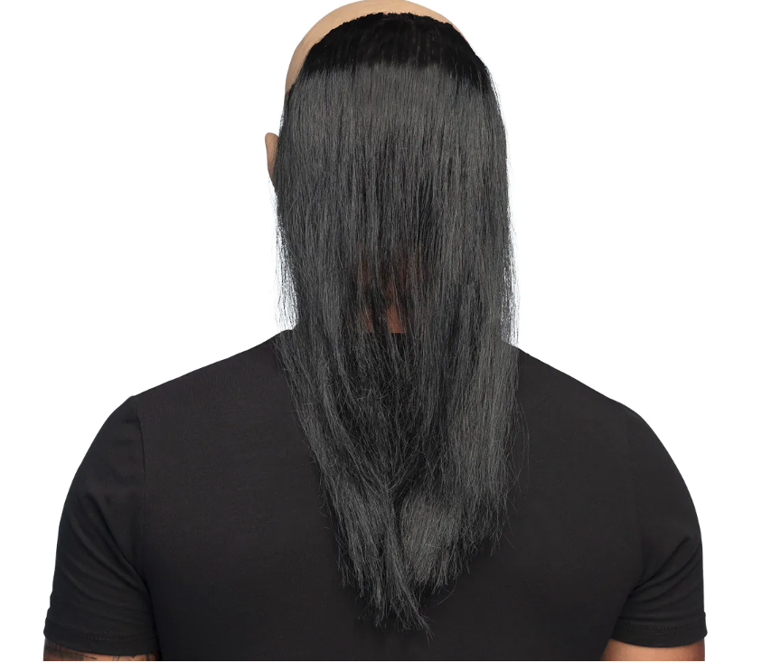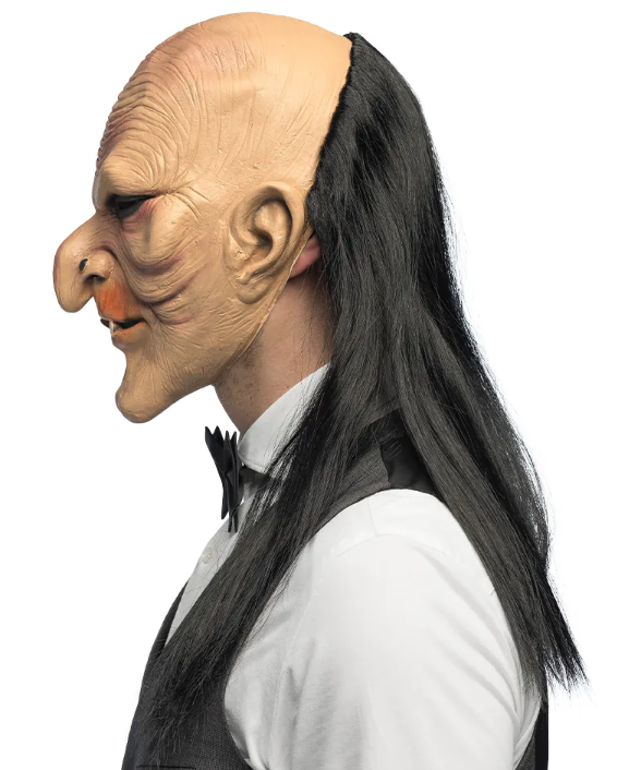 Латексная маска «Жуткий дворецкий» украшена длинными чёрными волосами, морщинистым лицом, длинным носом и кривыми зубами.