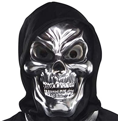 Plastmasas, sudraba krāsas sejas maska, maskas acu zonu klāj melns, plāns materiāls. Maska ir ērti valkājama, viegli pieguļ un pārklāj visu seju.