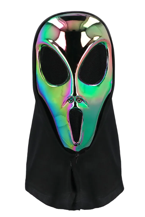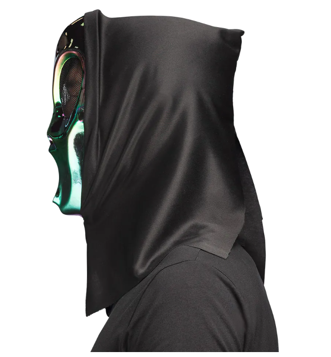 Пластиковая голографическая маска пришельца с чёрным капюшоном.