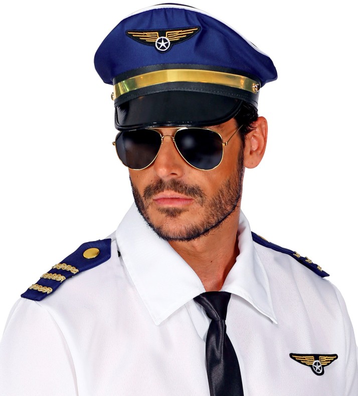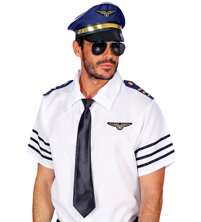 В комплект входит: пилотская фуражка, очки в авиаторском стиле, погоны и значок пилота.