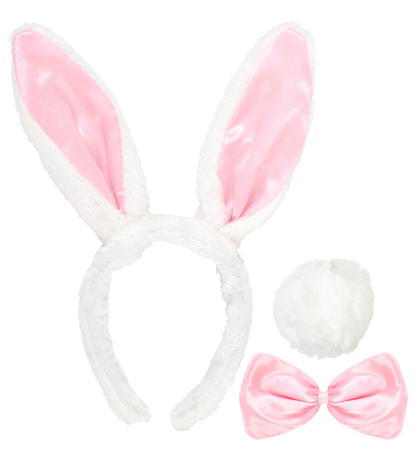В набор входят: повязка на голову с заячьими ушками и белым пушистым хвостиком, а также галстук-бабочка. Все аксессуары удобно фиксируются резинками.