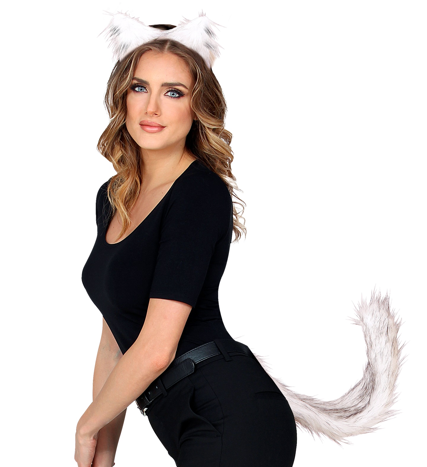 В комплект входят: повязка на голову с волчьими ушками и пушистый длинный хвост.