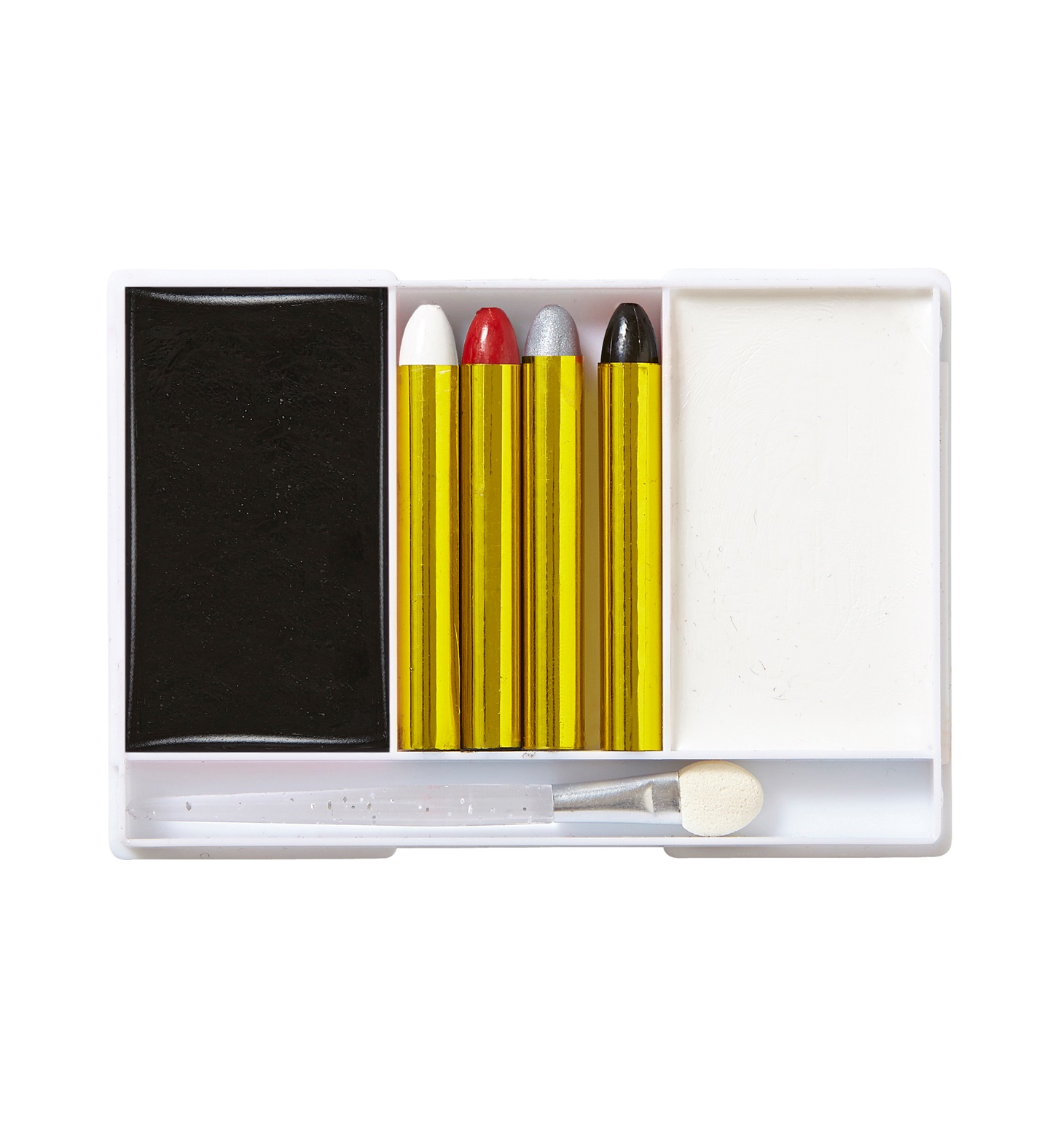 В набор входят разноцветные, высококачественные, мягкие четырёхцветные карандаши для макияжа, белая и чёрная палитра для макияжа и кисточка.
