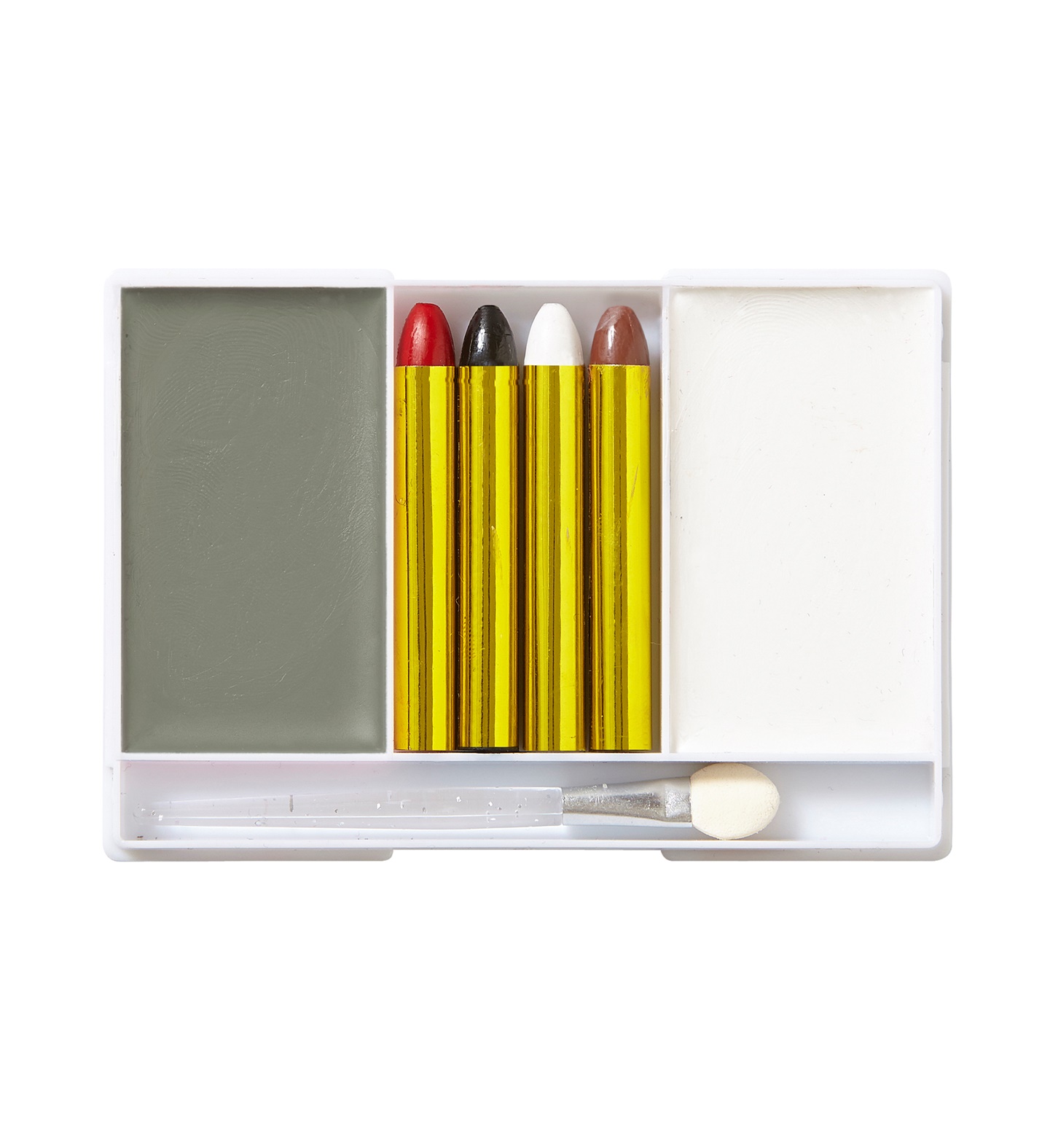 В набор входят разноцветные, высококачественные, мягкие четырёхцветные карандаши для макияжа, серо-белая палитра и кисточка.