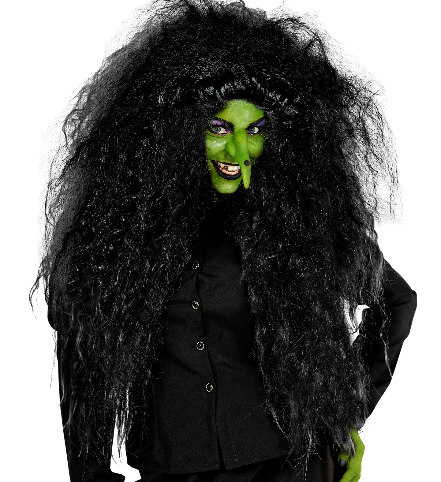 Парик «Ведьма-лохматка» отличается характерными чёрными волосами и небрежной укладкой.