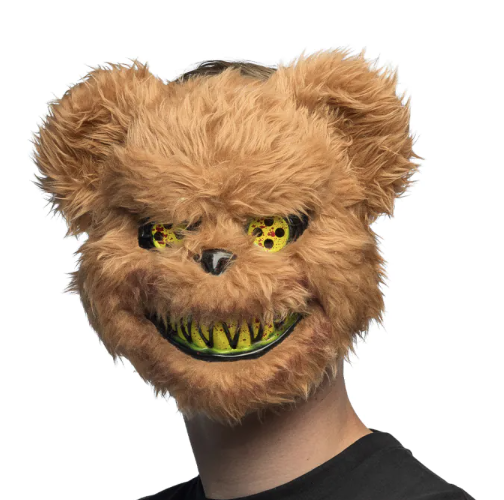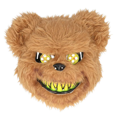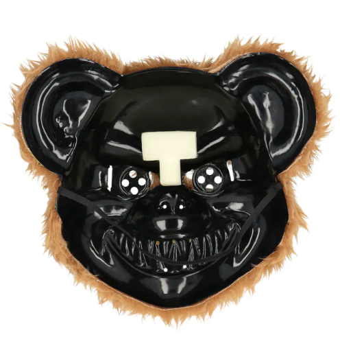 Brūna plīša maska “Trakais Lācis”, piestiprināta ar melnu gumiju.