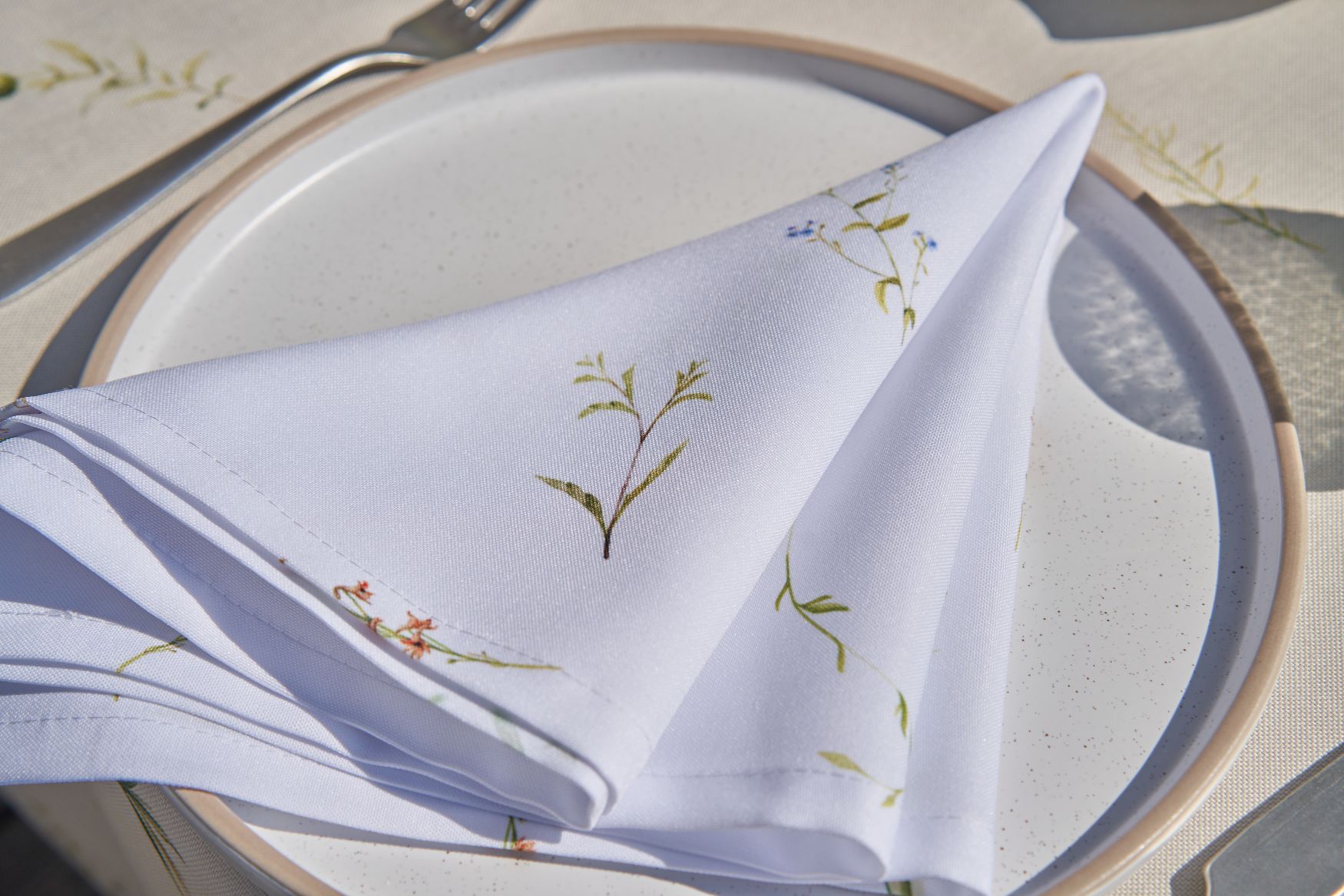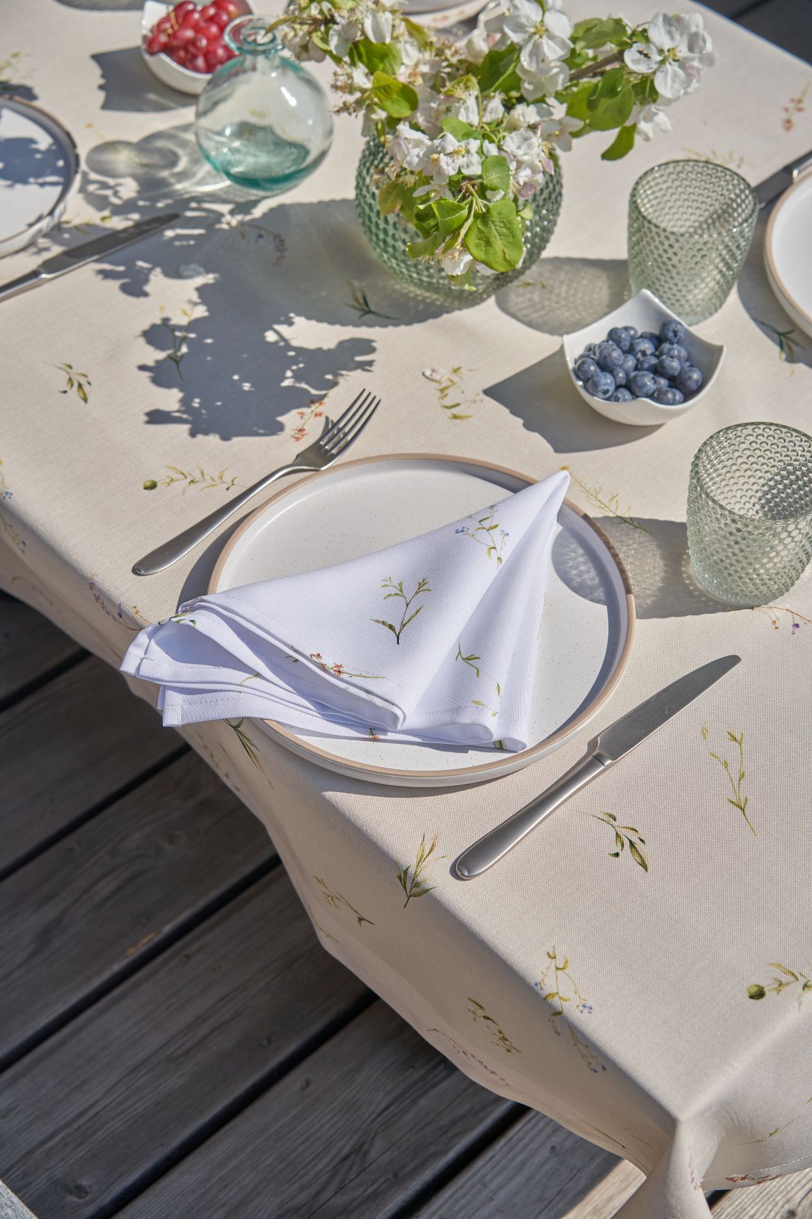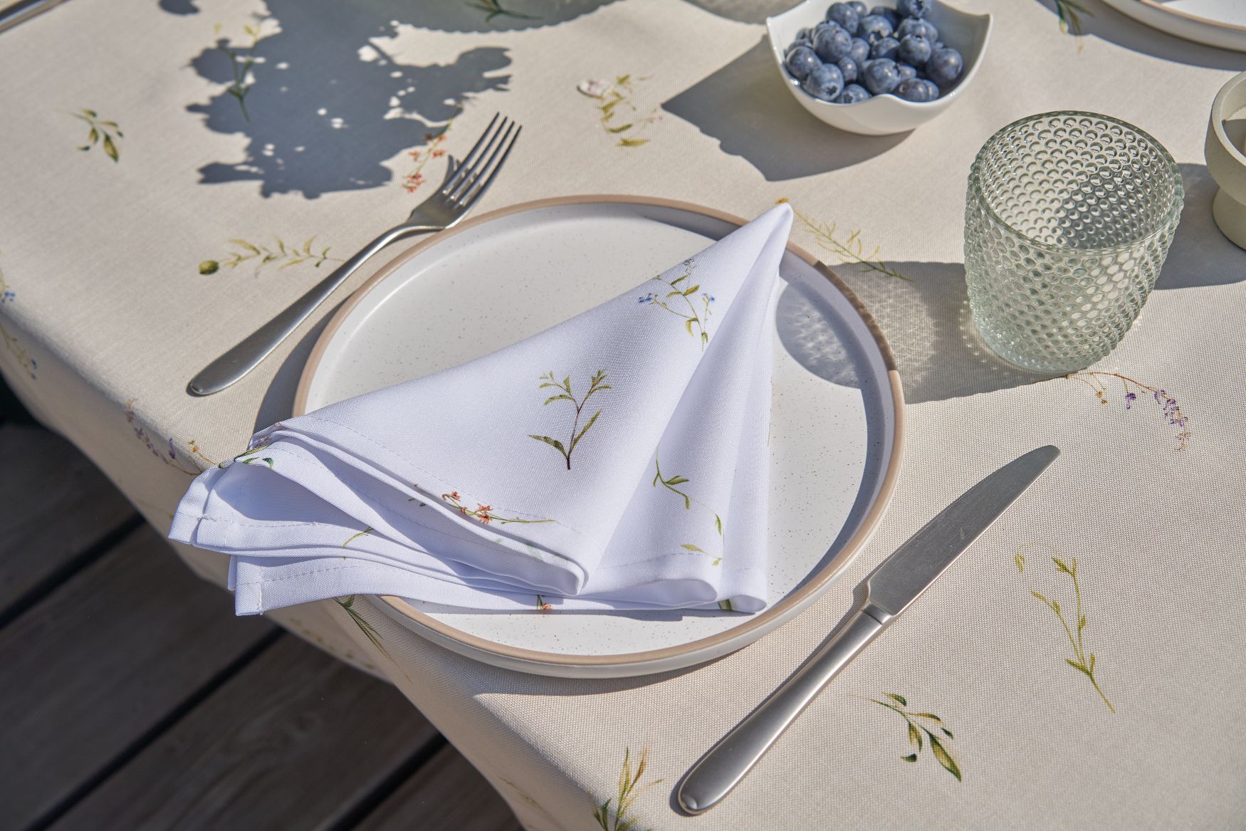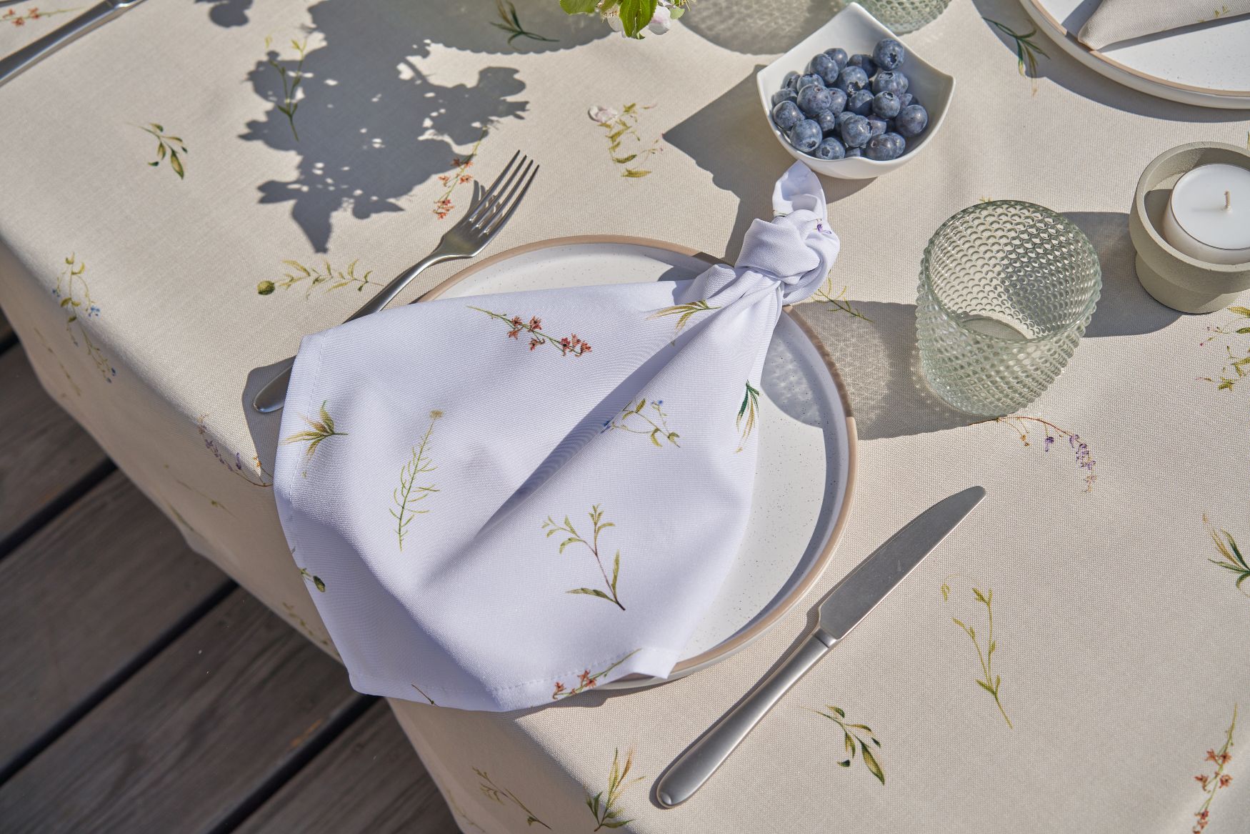 Белые салфетки с полевыми цветами придают ощущение весенней свежести.