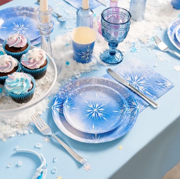 Zilas papīra salvetes, dekorētas ar sniegpārsliņu rakstu.