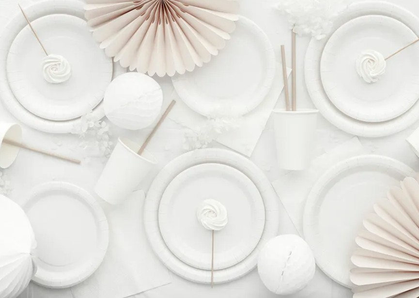 Белая высококачественная пластиковая скатерть. Особенно удобна, потому что не пропускает воду, легко чистится и может использоваться многократно.