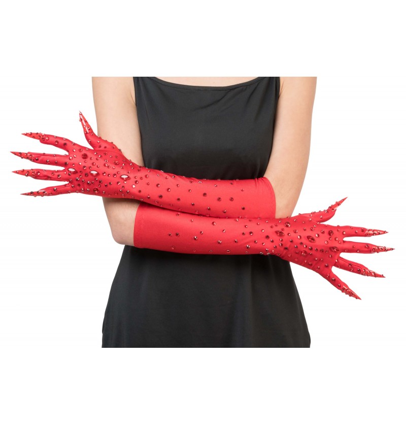 Sarkani auduma cimdi ar plastmasas gariem nagiem un sarkaniem kristāliņiem.