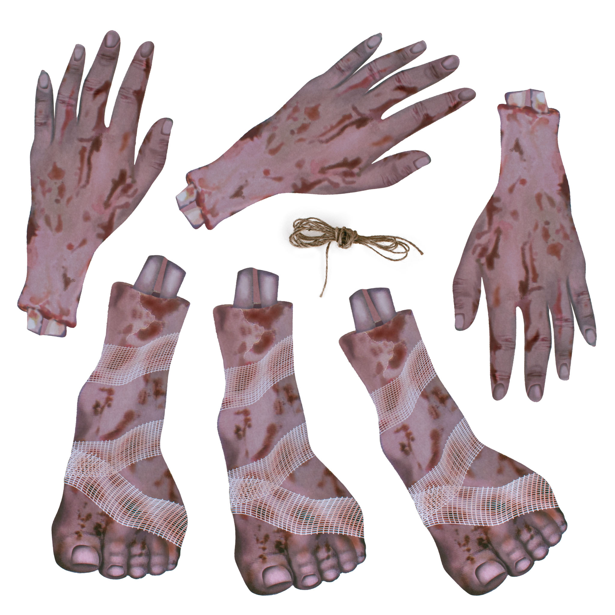 Dekorācija sastāv no trim asiņainām papīra rokām un trim kājām, kas savērtas kopā vītnē, kuru var viegli piekarināt istabā, pie durvīm vai loga.