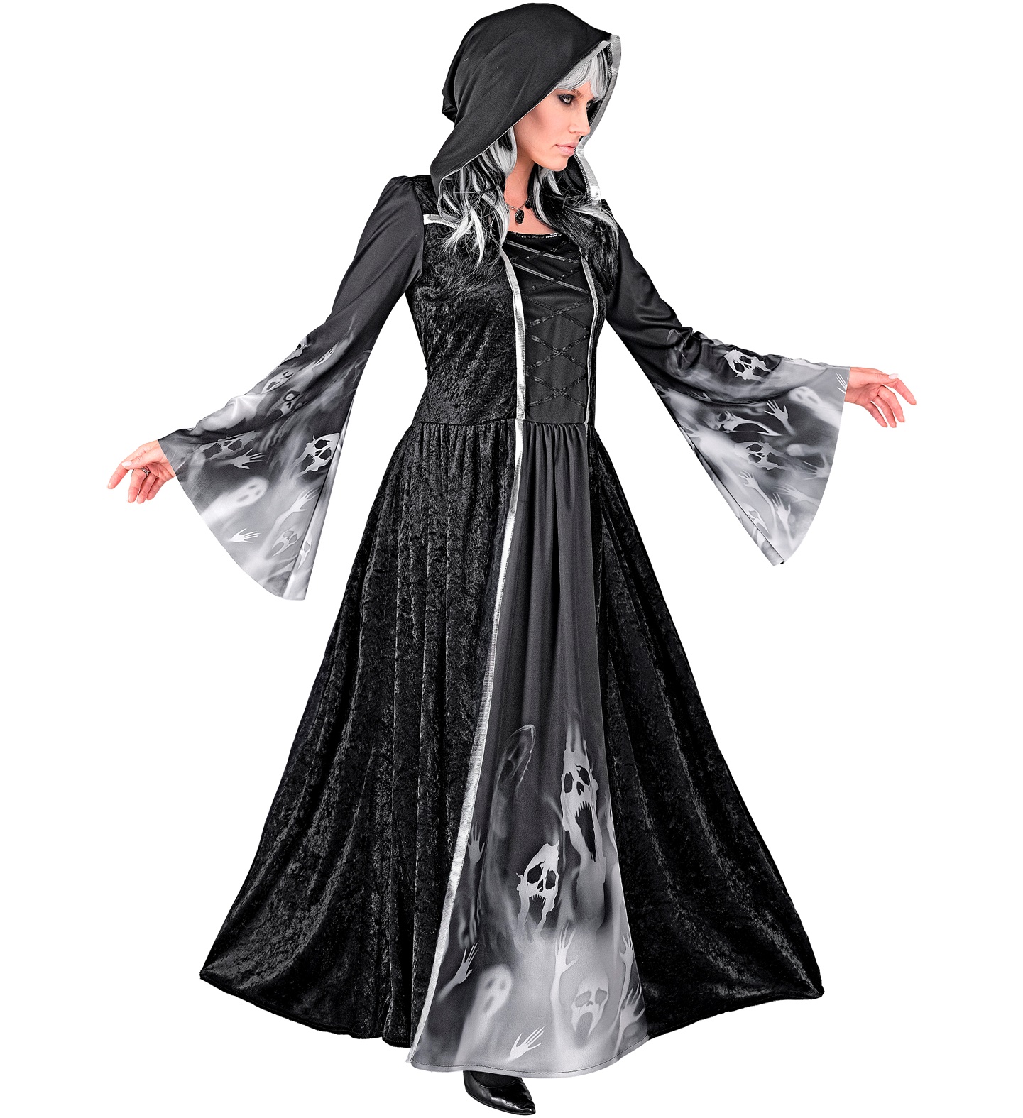 Длинное черное платье с капюшоном и широкими рукавами, украшенное загадочными серыми узорами, напоминающими лица кричащих духов, выходящих из темноты, создает жуткий, но в то же время элегантный образ. Корсетообразные шнуровки спереди придают силуэту платья элегантность, а облегающий верх контрастирует с широким низом в пол.